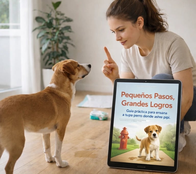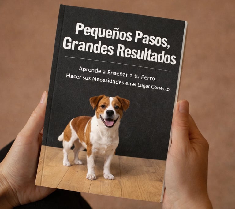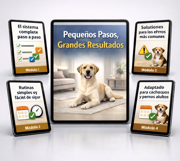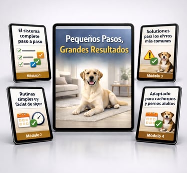 Pequeños Pasos, Grandes Logros es un método práctico paso a paso para que tu perro aprenda hábitos claros para hacer sus necesidades en el lugar correcto, de forma tranquila, constante y sin estrés para ninguno de los dos.